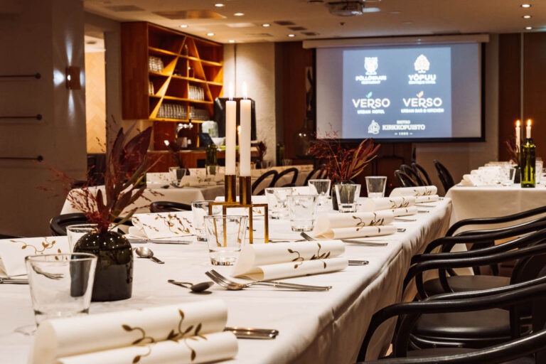 Hotelli Verso tarjoaa Jyväskylän keskeisimmällä paikalla upeat puitteet, joissa yhdistyvät moderni tyylikkyys ja tinkimätön toimivuus. Me ymmärrämme, että jokainen yritystapahtuma on ainutlaatuinen, ja siksi tarjoamme kymmenen monipuolista kokoustilaa, jotka voidaan räätälöidä vastaamaan täydellisesti tilaisuutenne luonnetta – olipa kyseessä pieni aamupalaveri, luova työpaja tai suuri kansainvälinen seminaari. Inspiroiva ympäristö ja huippuluokan tekniikka varmistavat, että osallistujien keskittyminen pysyy olennaisessa koko päivän ajan.