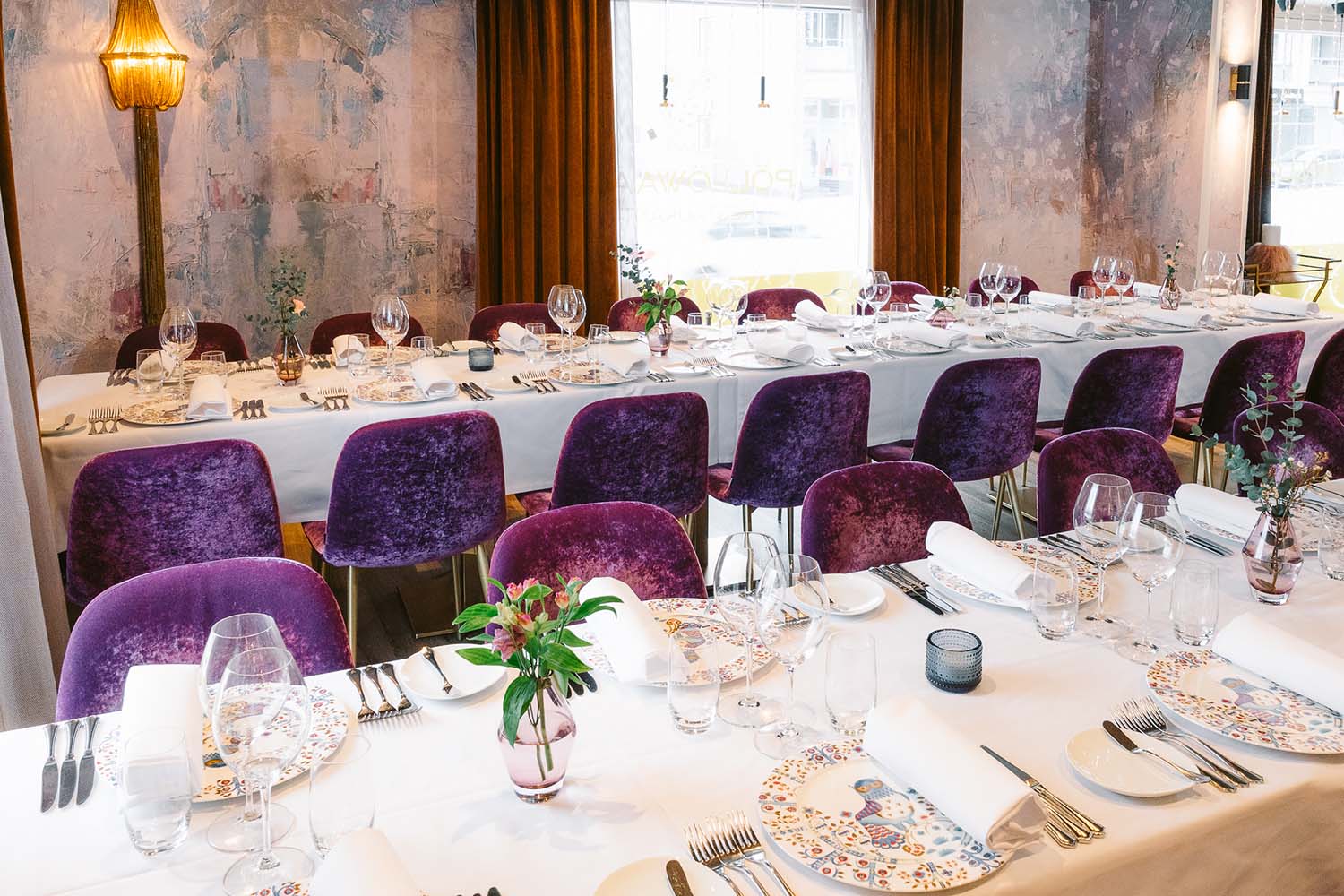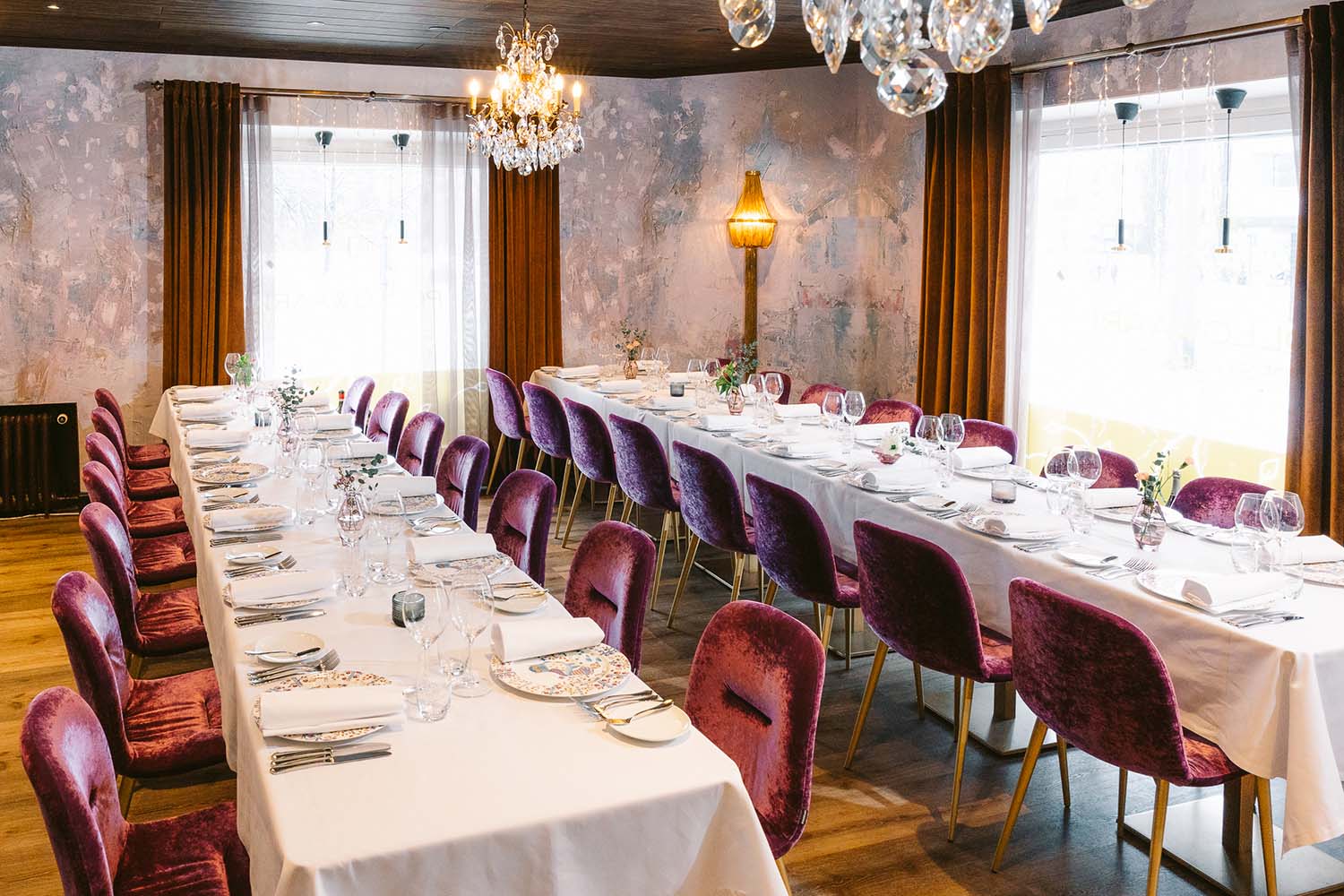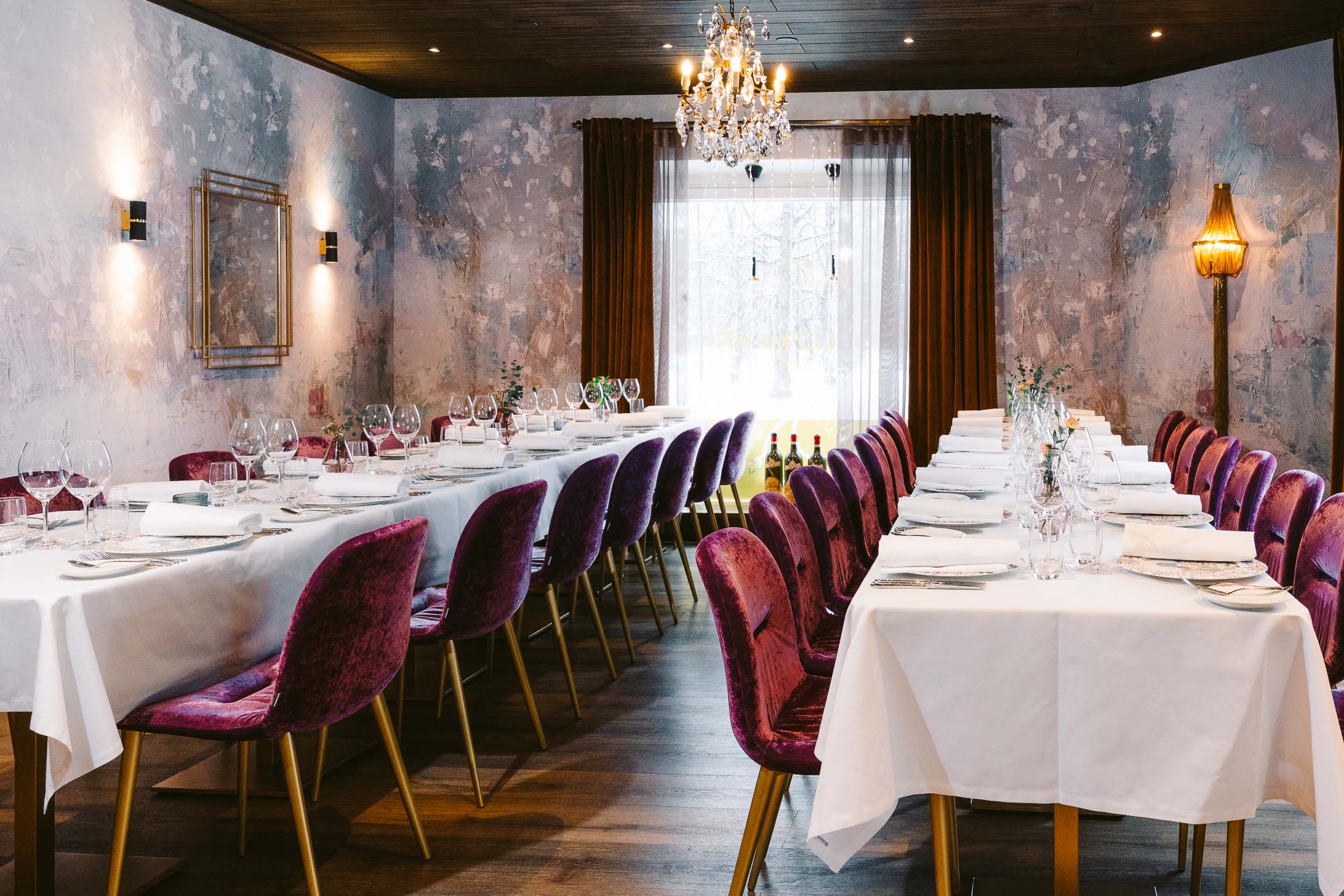 Tyylikäs, mielenkiintoisilla design- yksityiskohdilla maustettu ravintolasali