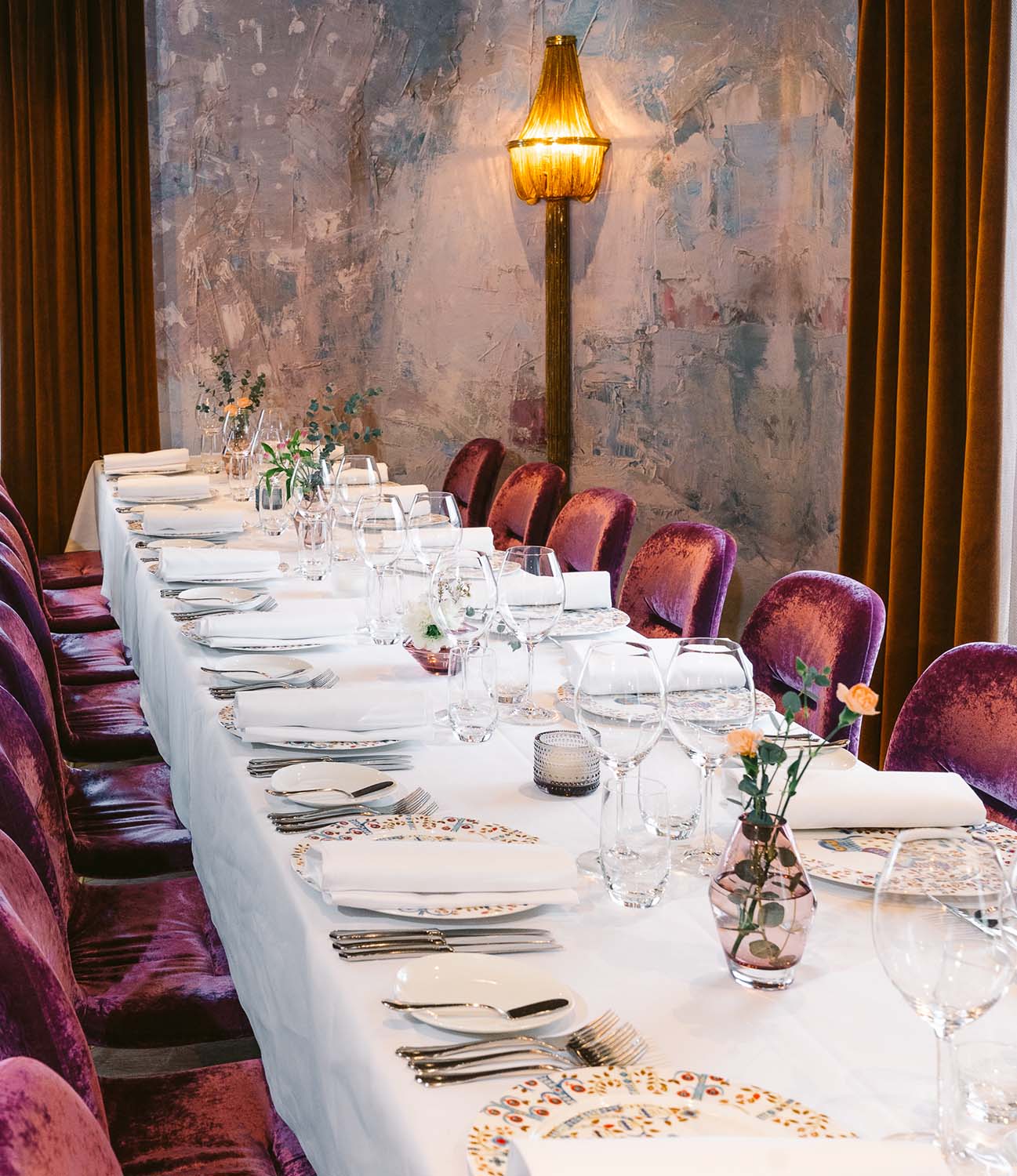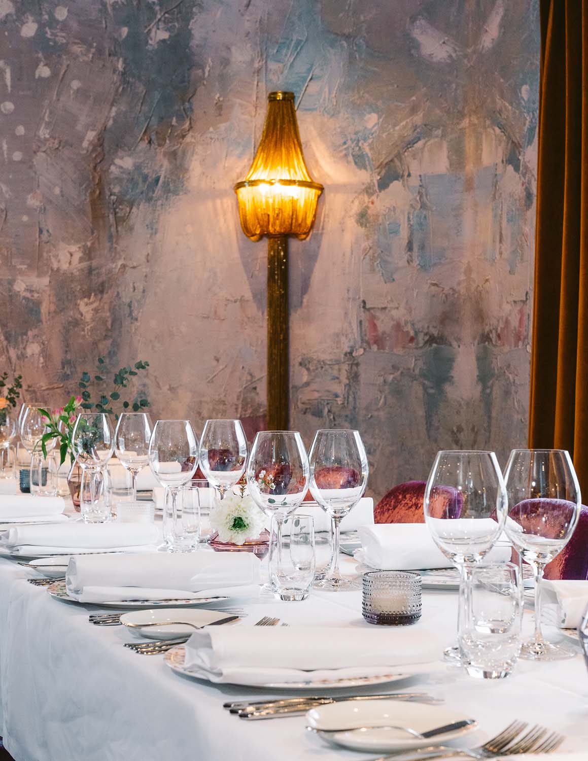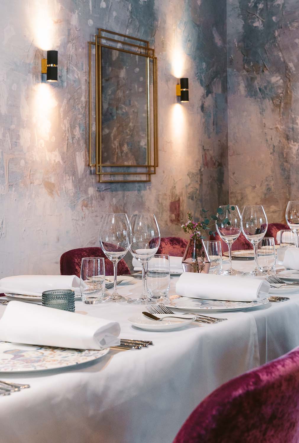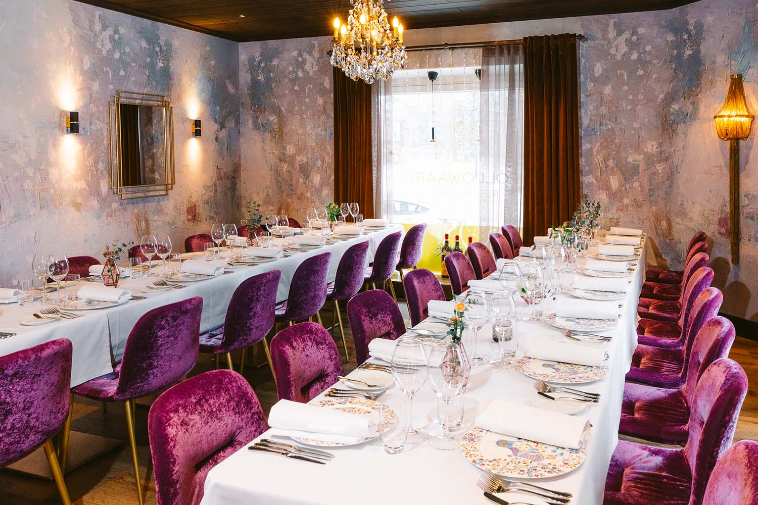 Tyylikäs, mielenkiintoisilla design- yksityiskohdilla maustettu ravintolasali